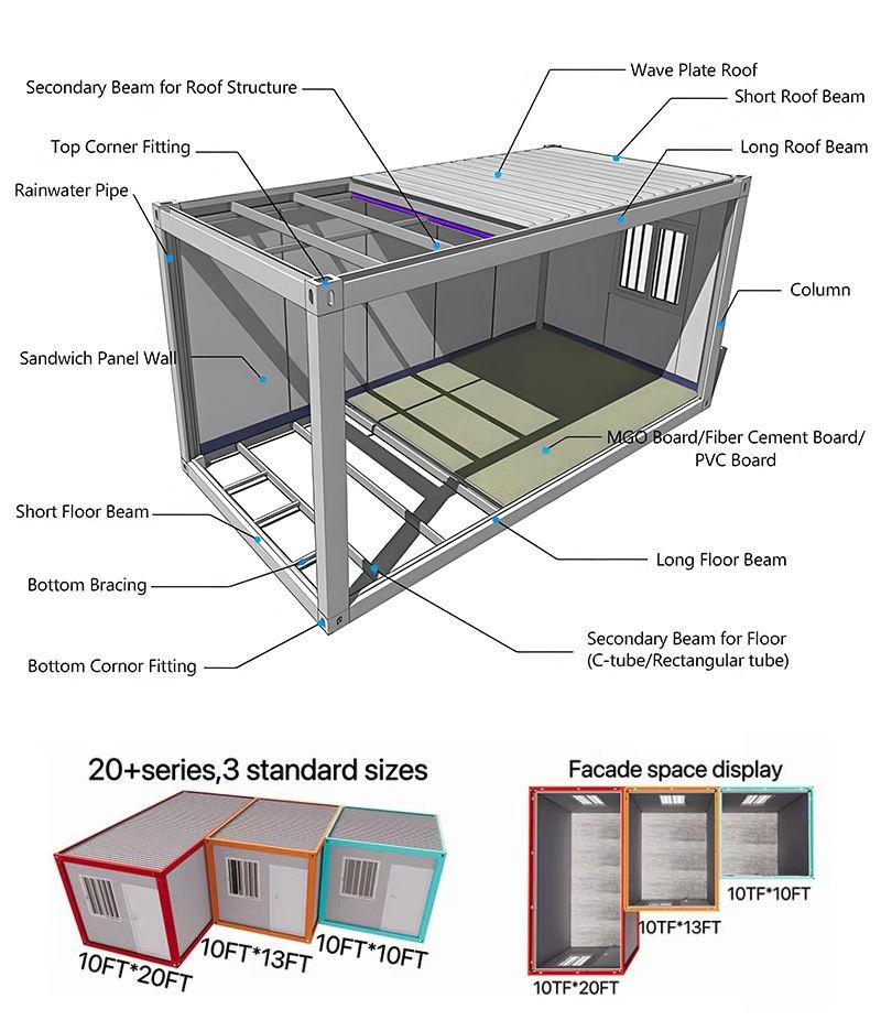 This 40ft Prefabricated Container House is made of durable sandwich panel steel, offering over 20 years of service life with advantages like excellent waterproofing (grade iP54), wind resistance (level 8-10), and thermal insulation exceeding 10°C.